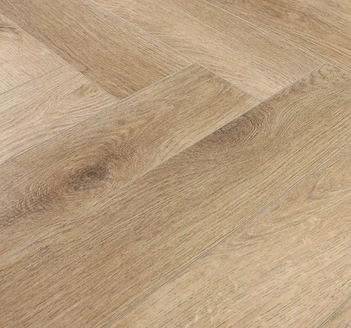 Кварц виниловый ламинат венгерская елочка Crona Floor из коллекции "Herringbone 4V" Дуб Монпелье имеет красивую поверхность цвета молочного шоколада без красных и зеленоватых оттенков, являясь по сути нейтральным, который хорошо сочетается с большинством цветовых вариаций. Основа такого влагостойкого ламината - это 65% камня и 35% поливинилхлорида (ПВХ), что обеспечивает экологичность и безопасность для окружающей среды.
